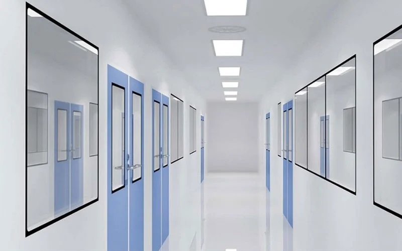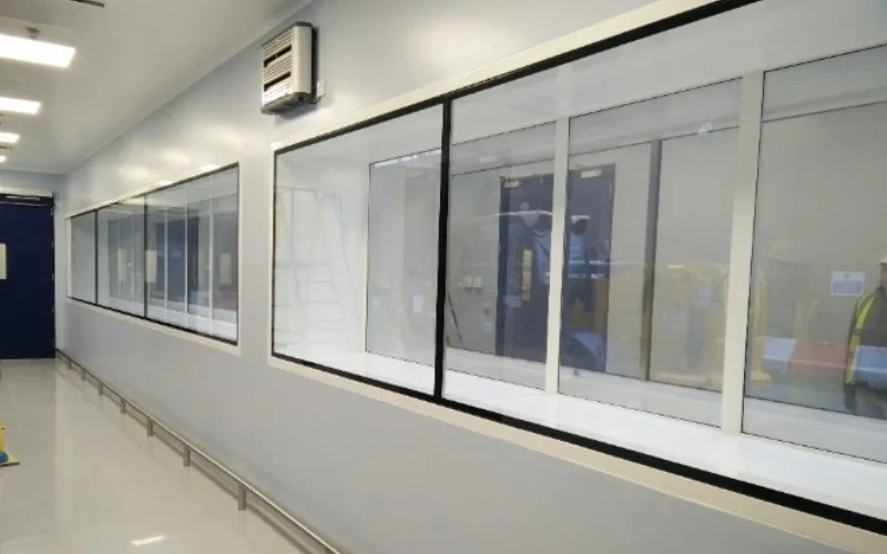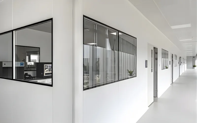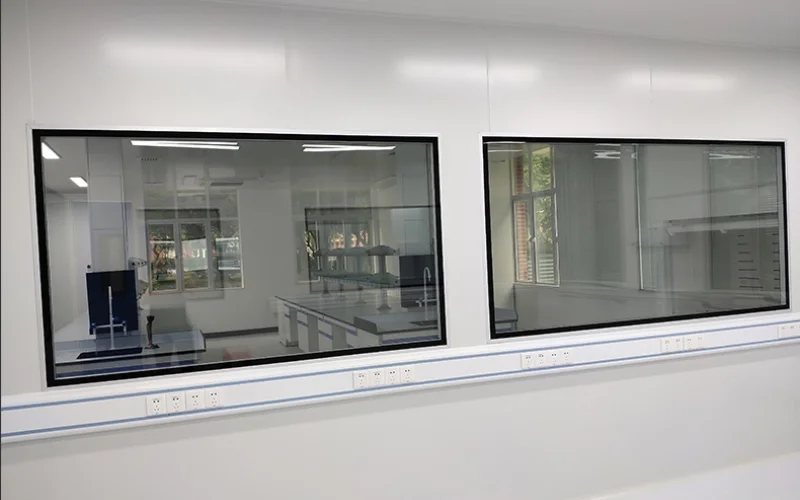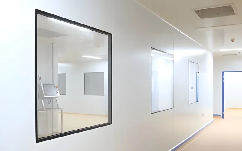 PakGusu cleanroom windows are fully flush with wall panels, enabling visibility between areas without compromising cleanliness.